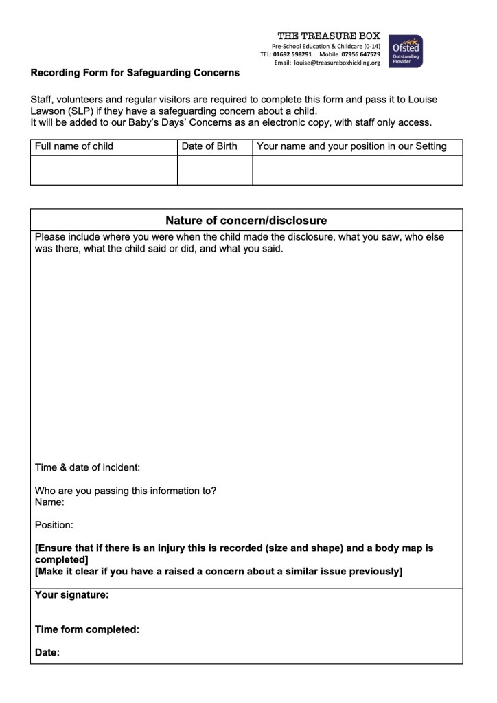| Recording form for reporting concerns |