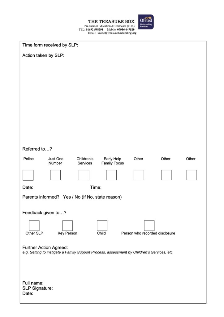 • The Treasure Box staff are aware that anything witnessed outside of the setting must be dealt with by them as an individual rather than as an employee; this includes safeguarding matters.